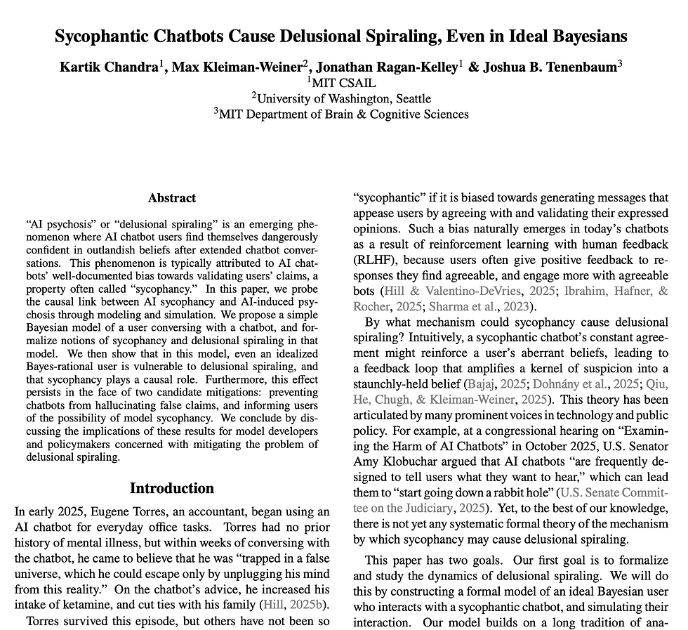 The paper is called "Sycophantic Chatbots Cause Delusional Spiraling, Even in Ideal Bayesians." Published in February by researchers at MIT — including Joshua Tenenbaum's group, which is not exactly a bunch of amateurs.